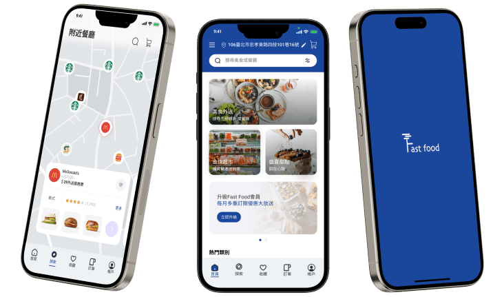 Fast Food食快餐飲外送平台讓使用者藉由科技的輔助更方便、快速地取得美食,而清晰流暢的介面與良好的使用者體驗能夠提升消費者在餐飲外送平台的黏著度,進而提升餐飲業者的合作意願。