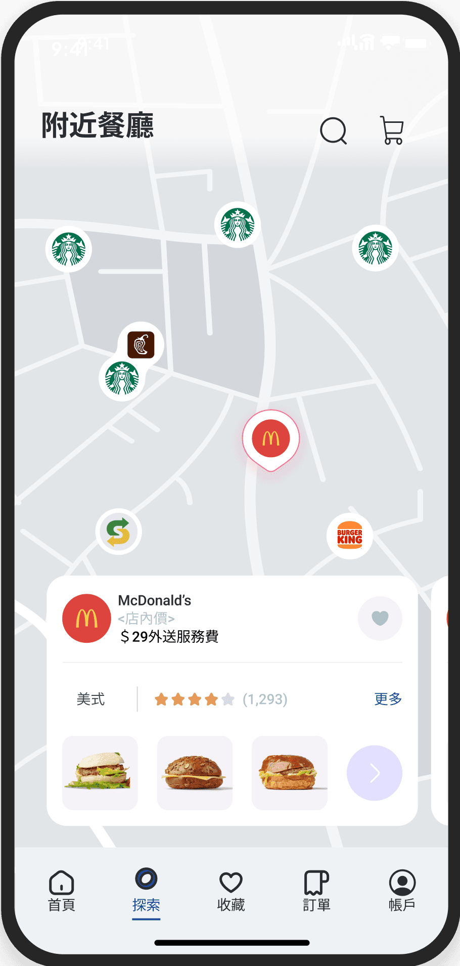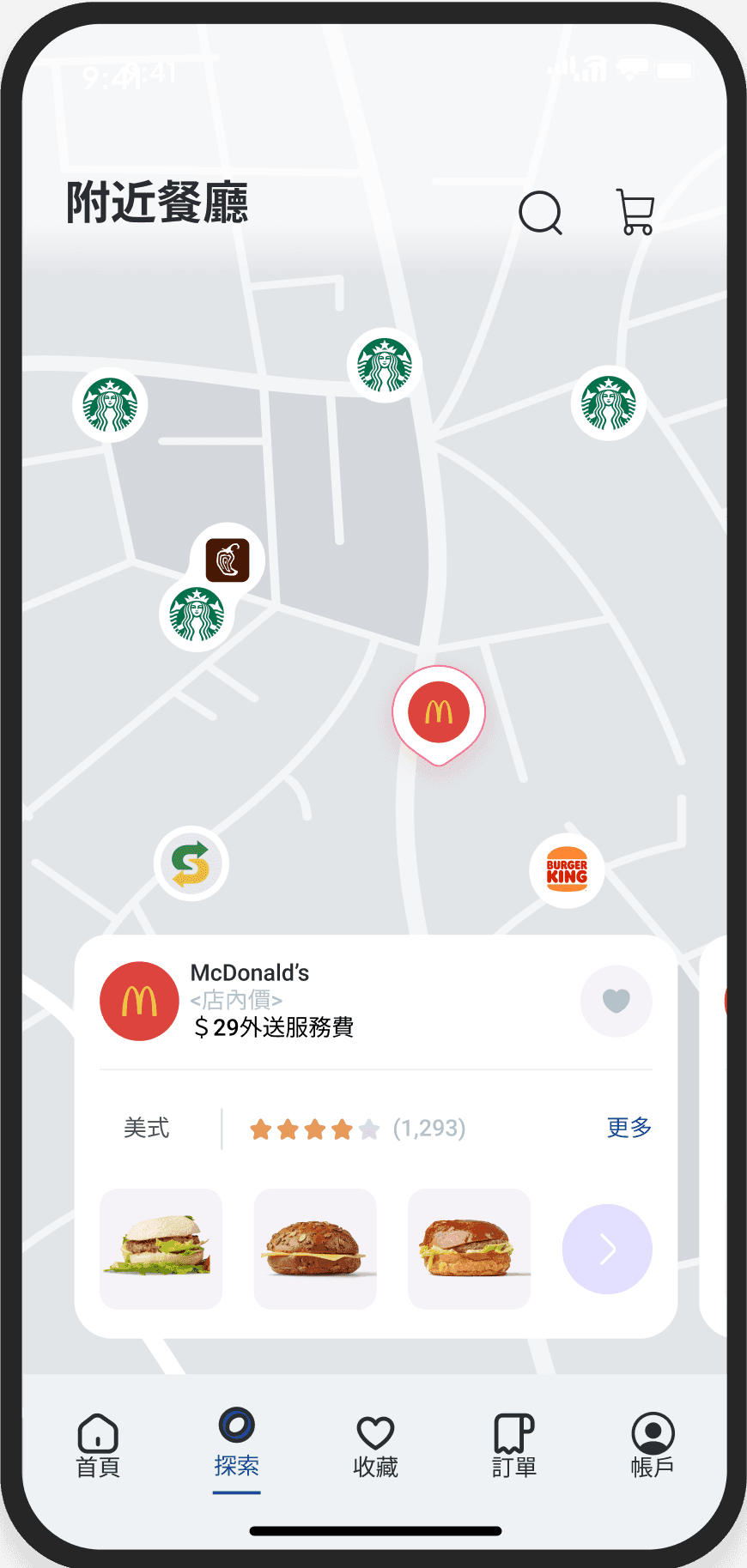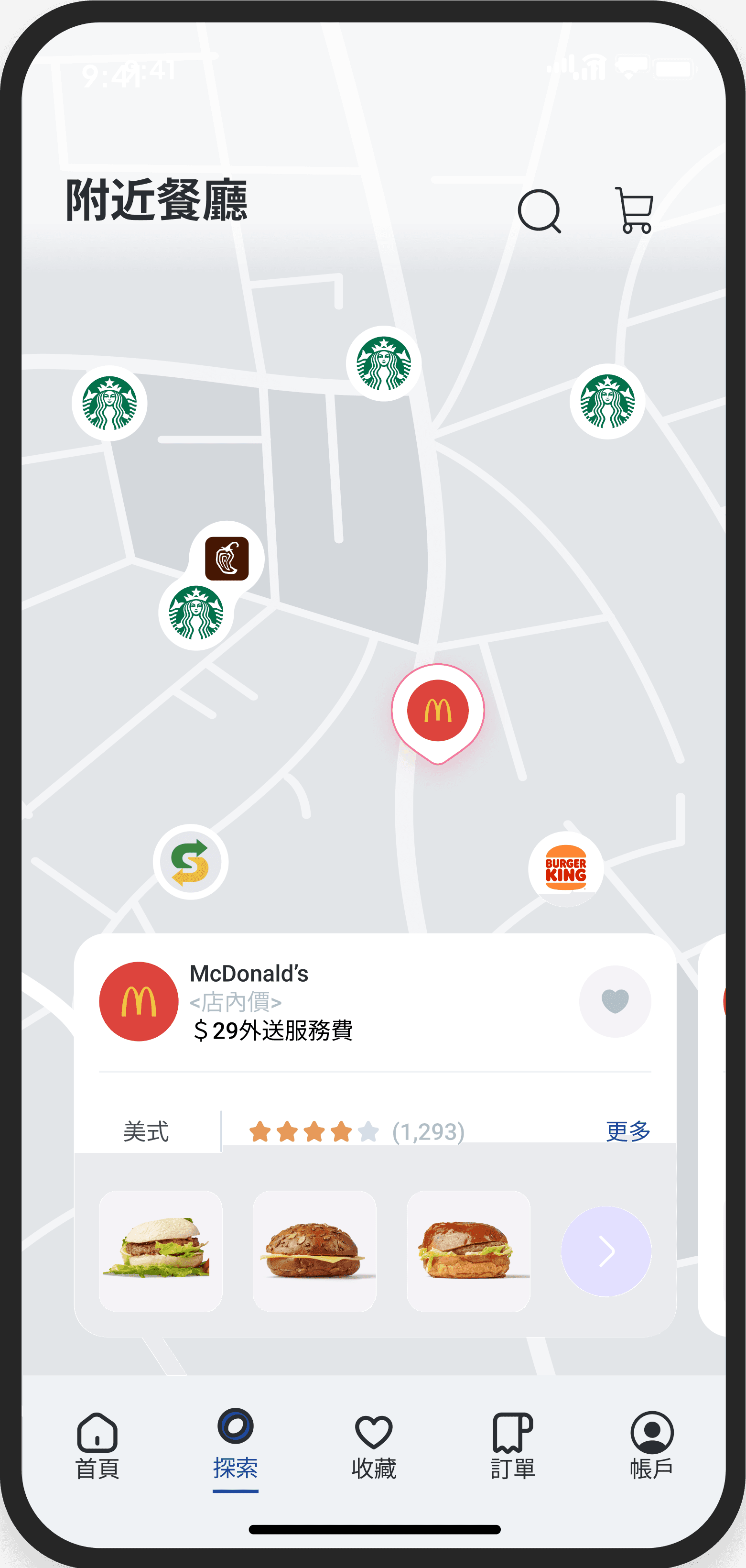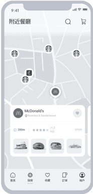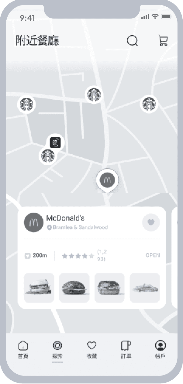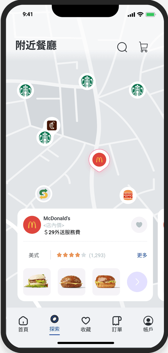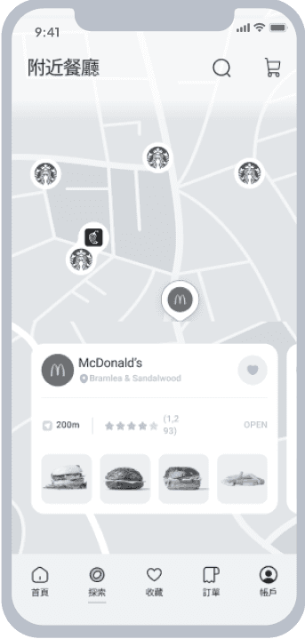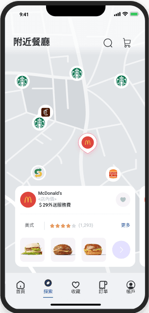 導覽列中的「探索」有地圖搜尋附近餐廳的功能,讓隨意 瀏覽的使用者能藉此找到美食。