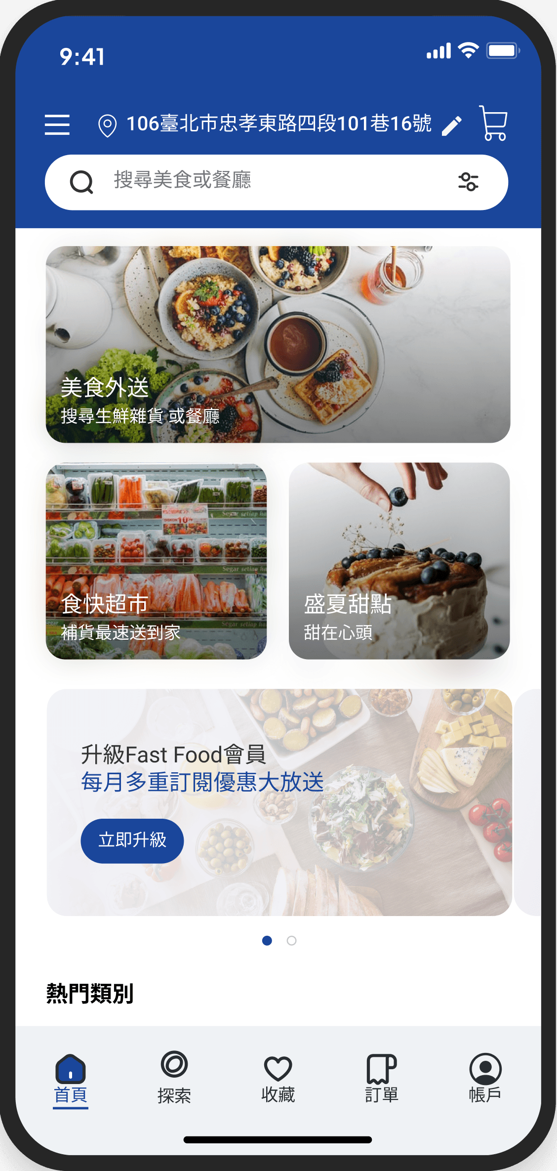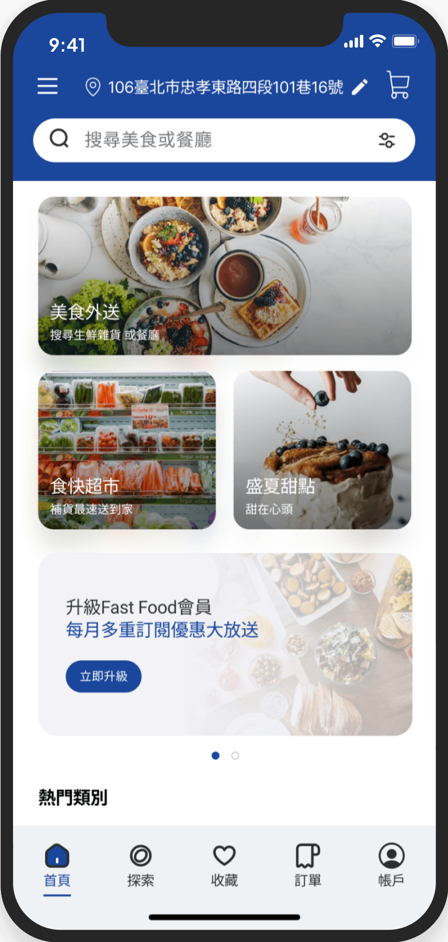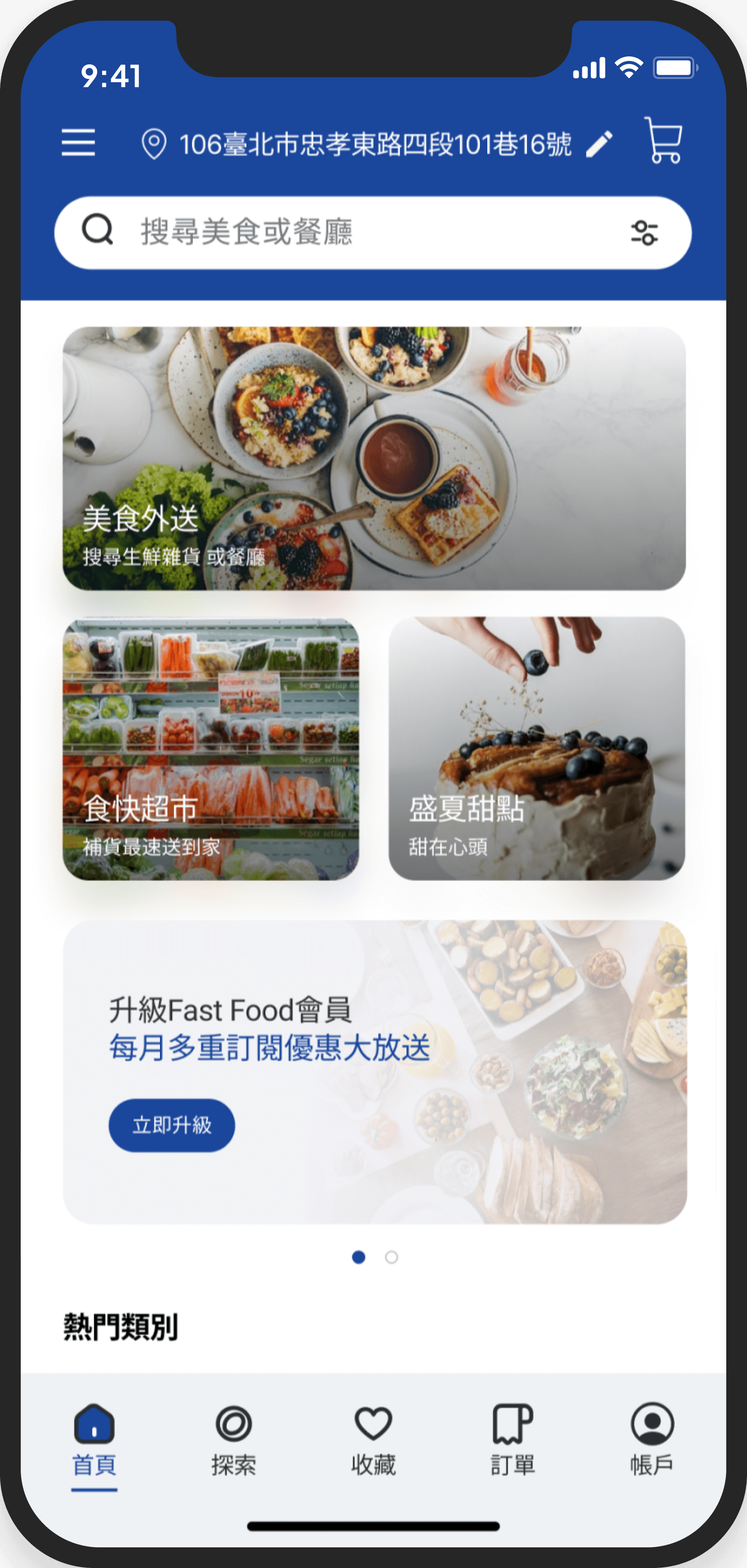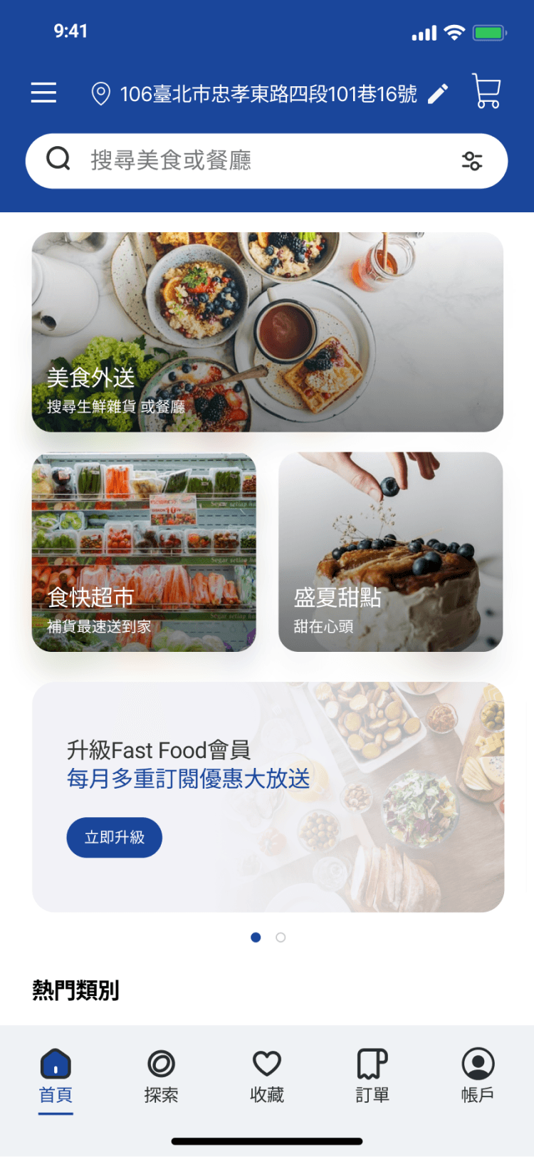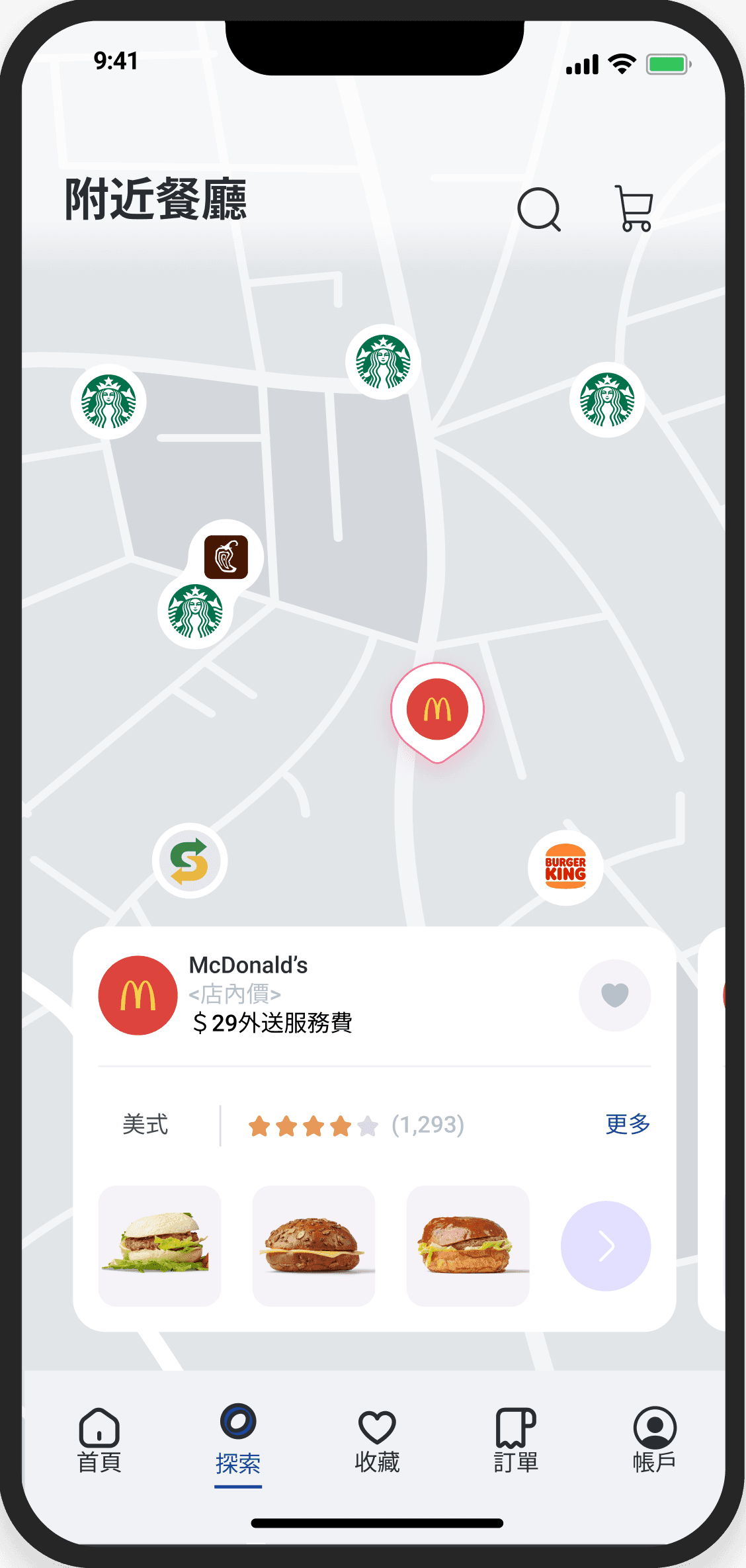 導覽列中的「探索」有地圖搜尋附近餐廳的功能,讓隨意 瀏覽的使用者能藉此找到美食。