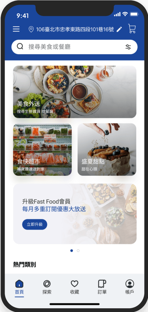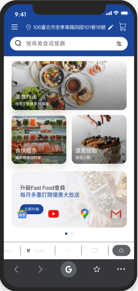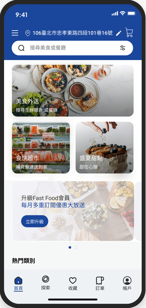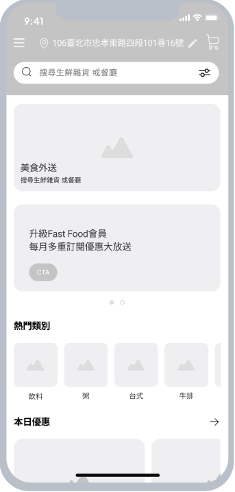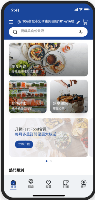 Fast food食快餐飲外送平台讓使用者藉由科技的輔助更方便、快速地取得美食,而清晰流暢的介面與良好的使用者體驗能夠提升消費者在餐飲外送平台的黏著度,進而提升餐飲業者的合作意願。