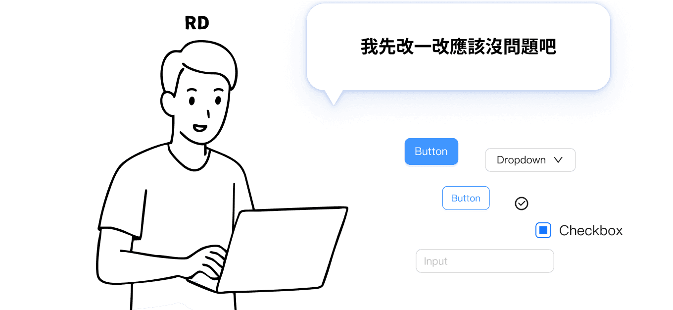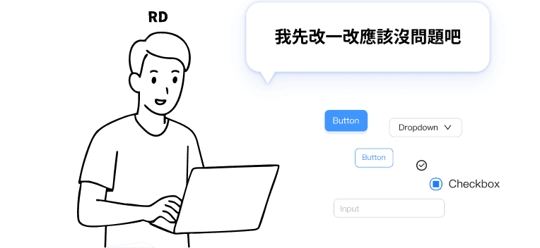 當不同團隊需要使用同一元件時,由於沒有共用規範,往往在各自專案中獨立開發,導致工程師重工、設計師也需在不同專案中多次檢驗,後期修改更需投入多位人力,增加錯誤風險。