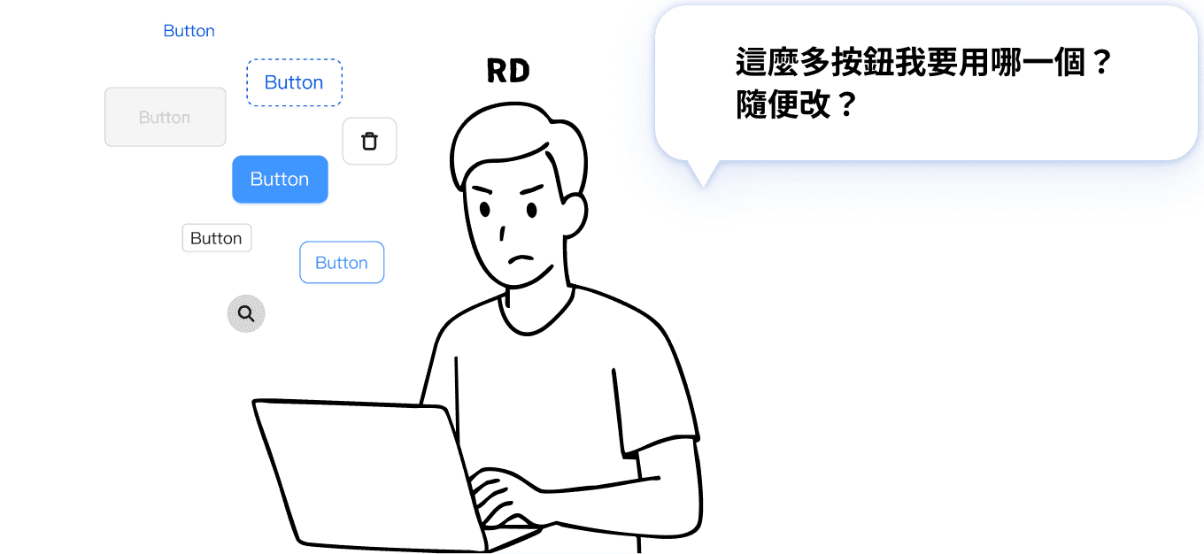 設計師之間對元件的定義與使用方式缺乏共識,導致相同元件在不同設計師手上呈現出不同風格與交互,降低了產品的一致性,甚至影響了團隊間的信任。